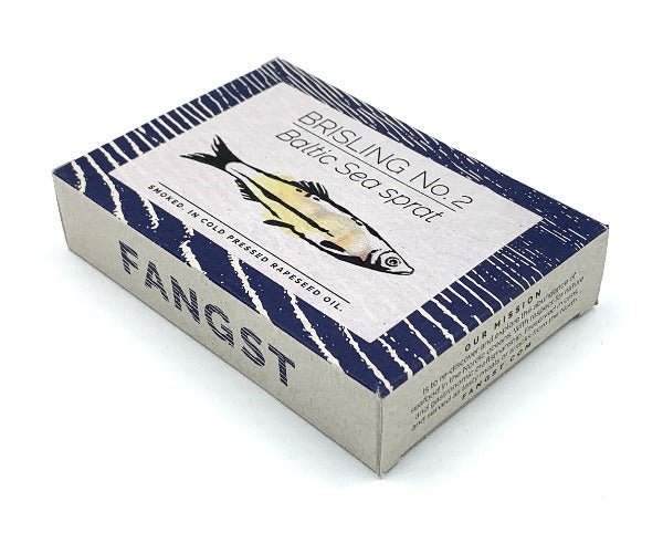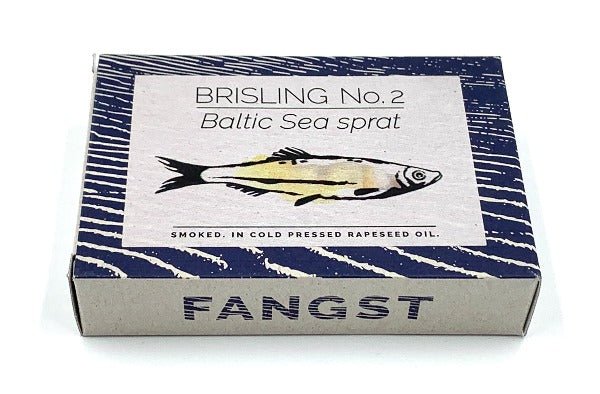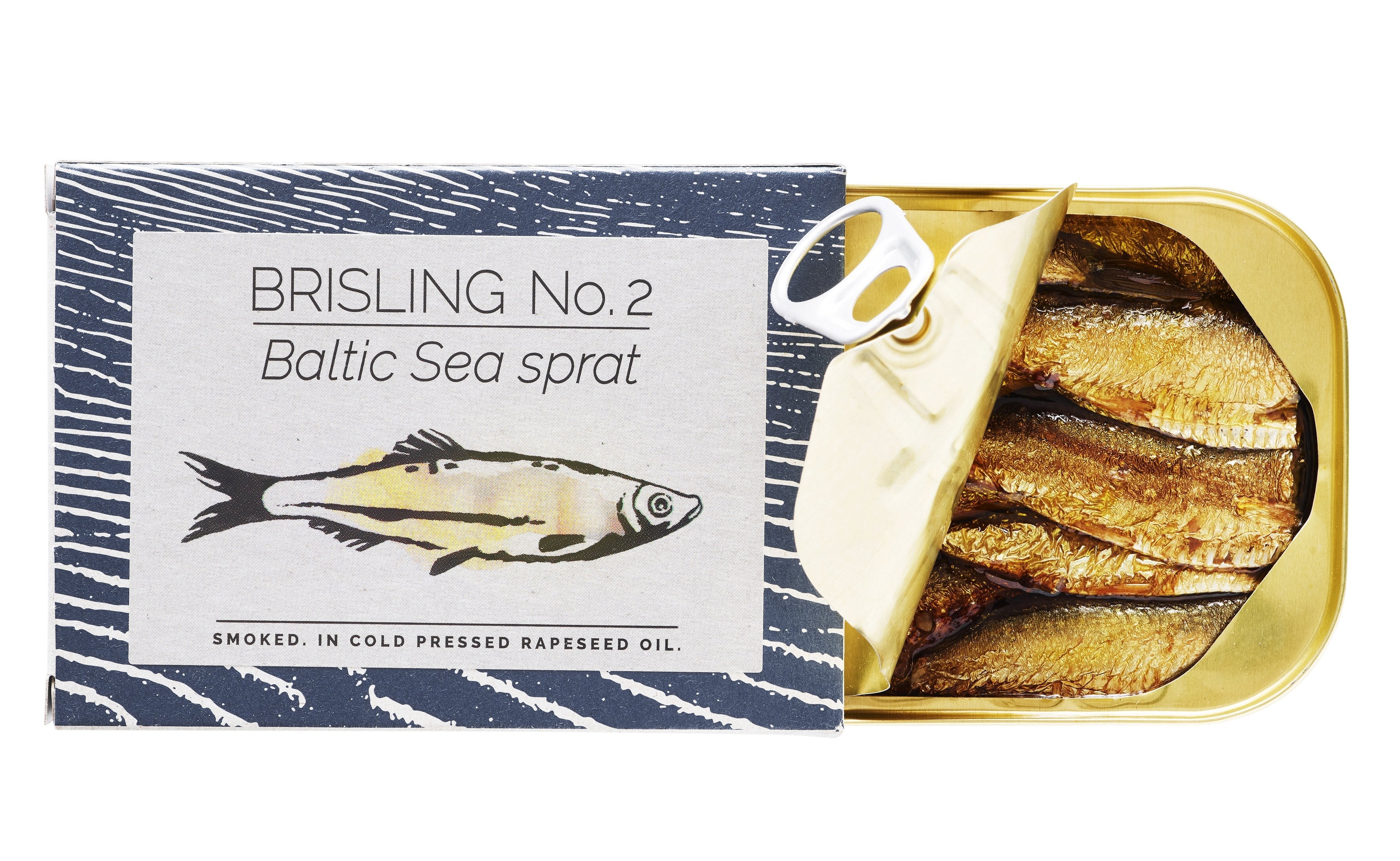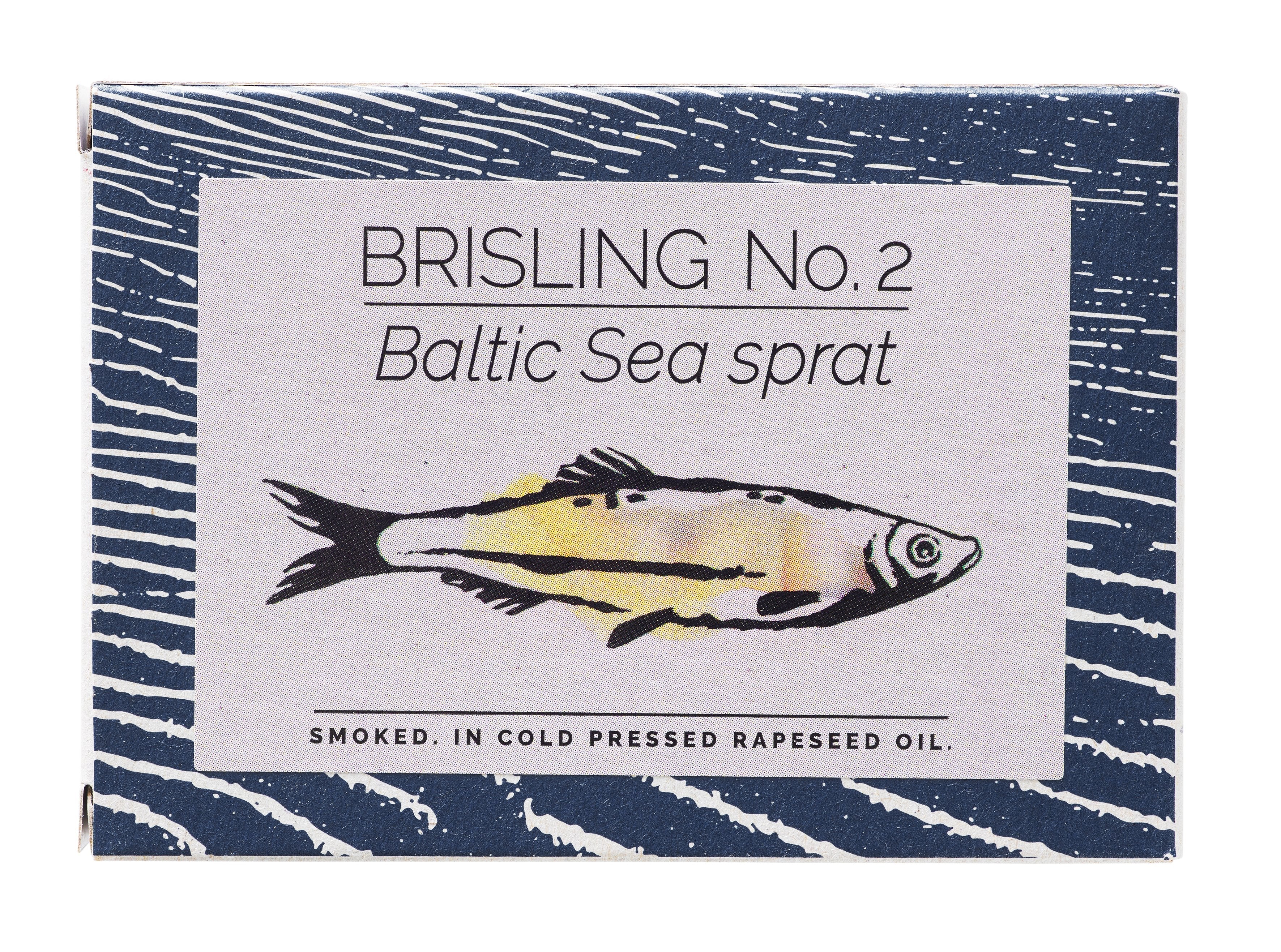 Sprats de la mer Baltique, légèrement fumés, dans de l'huile de colza pressée à froid, préparé et mis en boîte à la main au Danemark.