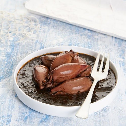 Ingrédients : calamars, huile d'olive, oignon, tomate, vin, épices, sel et encre de calamar
